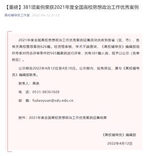 为深入学习贯彻习近平新时代中国特色社会主义思想,全面学习宣传党的十九届六中全会精神,落实立德树人根本任务,系统回顾全国高校思想政治工作会议召开以来高校思想政治工作的成效与经验,引导辅导员加强工作研究,总结工作经验,提炼工作成果,提升高校思想政治工作质量。我校积极参加由教育部思想政治工作司指导、《高校辅导员》编辑部开展的2021年度全国高校思想政治工作优秀案例征集活动。活动中,我校汽车工程学院辅导员孟洁老师申报的《润物无声,静待花开,用爱引领成长——记一名学业预警学生的“变形记”》案例荣获活动二等奖。