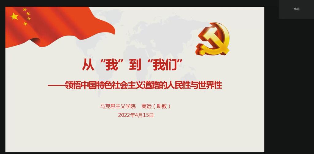 马克思主义学院教师高远以“从‘我’到‘我们’——领悟中国特色社会主义道路的人民性与世界性”为题,从中国特色社会主义道路的人民性、世界性以及坚持中国道路、坚持胸怀天下这三个方面进行了领学。