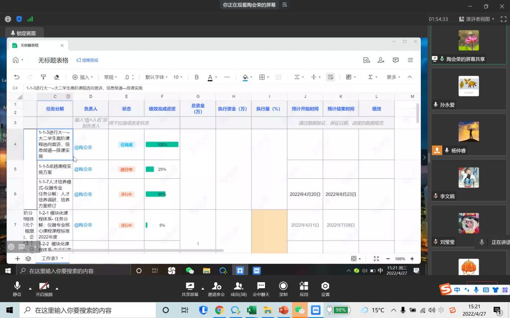 活动中,学院全体教师逐一发言,围绕人才培养目标、资源建设、教材教法改革、师资队伍建设、实践教学基地、技术技能平台、社会服务、国际交流与合作、可持续发展保障机制等9大建设项目,逐项梳理个人台账,就建设任务、建设绩效、时间节点等方面进行了详细说明,并重点围绕职教本科的申报、科研、创新创业等方面展开讨论。
