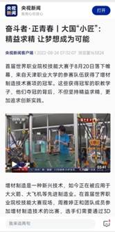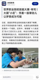 大会期间,央视新闻直播间与郑清春校长连线互动交流职业教育发展情况。中央广播电视总台先后3次对我校增材制造赛项金奖团队师生进行专访,并于8月22日晚新闻联播栏目首播。8月23、24日,央视新闻客户端分别以《世界职业院校技能大赛特写:大国小匠凭着一股犟劲儿让梦想成为可能》《奋斗者正青春:大国小匠精益求精 让梦想成为可能》为题对比赛背后的故事进行深度报道,阐释了园丁育人故事和大国“小匠”们非同寻常的努力和付出。