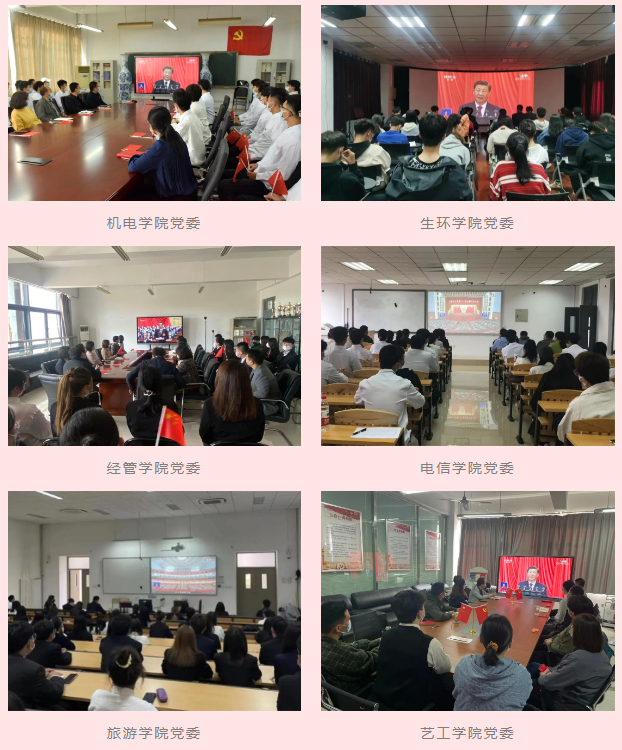 学校党委高度重视,精心部署,全校党员干部师生把收听收看党的二十大开幕会盛况作为一项重要的政治任务,落实到每一个基层支部、每一位党员、每一位师生。10月16日上午10:00,学校召开校党委理论学习中心组学习(扩大)会议,校党委副书记、校长郑清春,校党委副书记王海龙,副校长刘石英、李树岭、杨荣敏,校纪委书记唐勇,及校党委理论学习中心组成员、部分学院处级领导干部、机关各部门科级及以上领导干部和优秀学生代表们一起,在主校区和海河园校区两个报告厅,集中观看了党的二十大开幕会。市教委法制处陶涛同志,莅临海河园报告厅现场,与我校师生共同收看了盛会实况。我校各基层党委、党总支积极组织师生员工利用电视、网络、广播等各种媒体,以多种形式认真收听收看党的二十大开幕盛况,使广大师生党员在第一时间了解和把握大会精神。