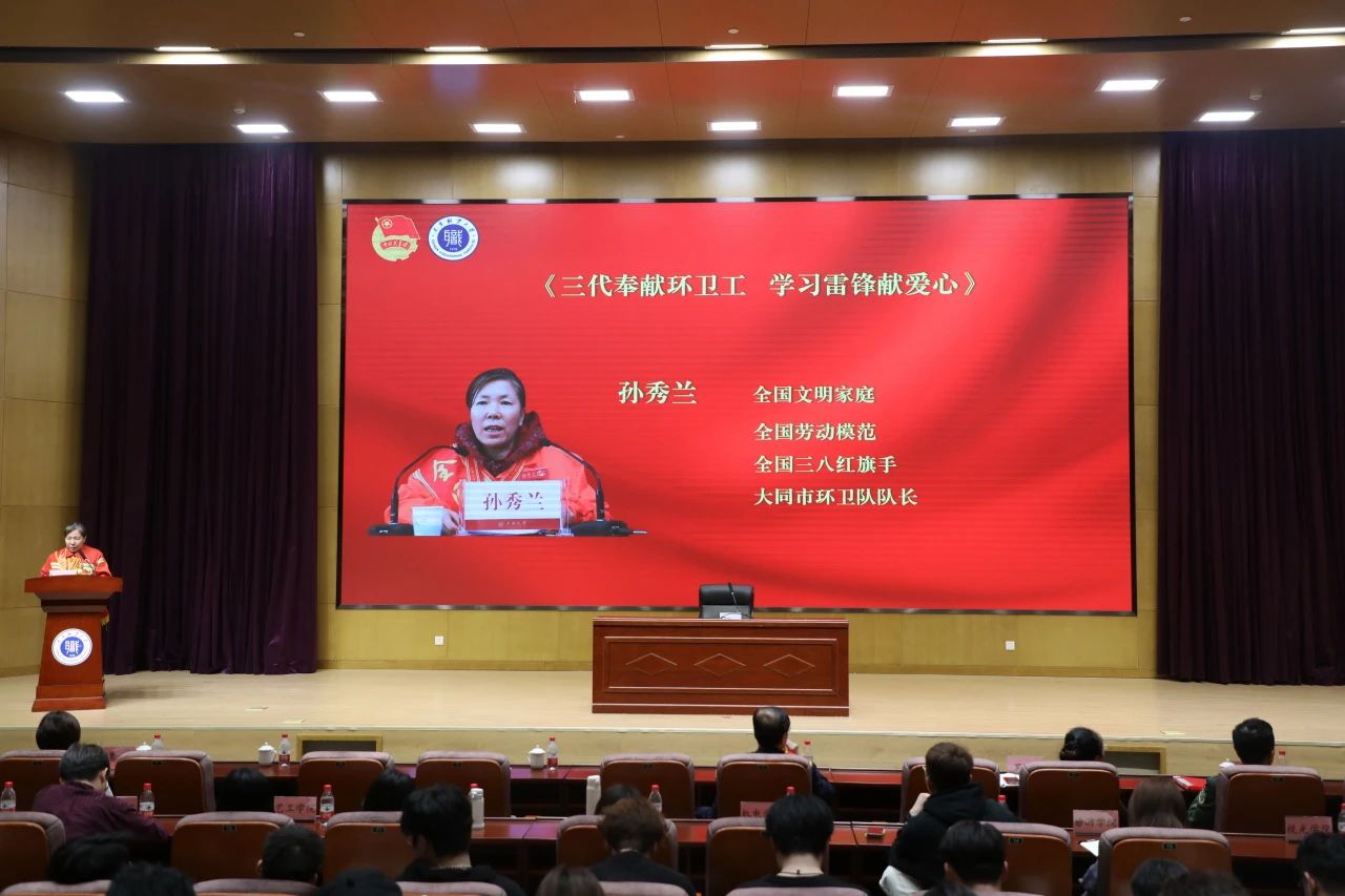 受到习近平总书记接见的全国文明家庭、全国劳动模范、全国三八红旗手、大同市环卫队队长孙秀兰同志以《三代奉献环卫工,学习雷锋献爱心》为题作了报告,她讲述了自己作为环卫工人的故事,感人的事迹令人动容,让我们看到了榜样的力量和英模家庭的示范作用,感受到雷锋精神的不断传承与别样温暖。