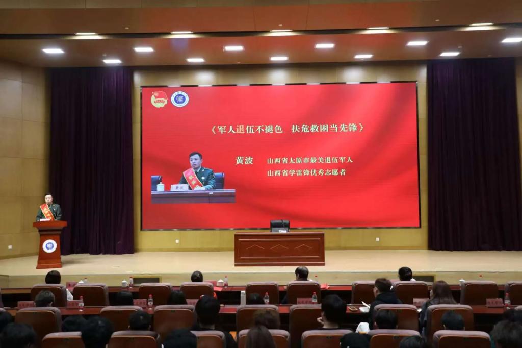 山西最美退伍军人、山西学雷锋优秀志愿者黄波同志报告的题目是《军人退伍不褪色,扶危救困当先锋》,讲述了自己退伍20余年仍坚持喊“到”、用实际行动践行雷锋精神的经历和切身感悟,向大家展现了一名退伍军人以及“退役不褪志,退伍不褪色”的责任担当,和为人民服务永远在路上的情怀。