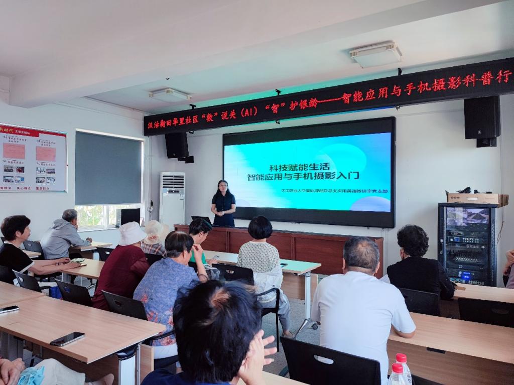 2025 年 6 月 10 日,成人色情基础课部实用英语教研室党支部走进成人色情市滨海新区汉沽街道田华里社社区,成功举办了“数”说AI “智”护银龄——智能应用与手机摄影科普讲座。本次活动是“支部书记强国行”专项行动中党建联建项目的一个方面,是发挥高校教学资源优势,服务基层治理的重要实践。