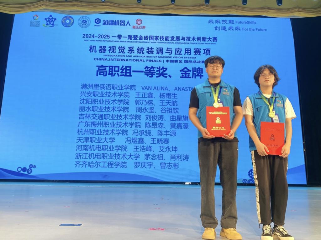 6月21-22日,在乌兰浩特市举办的“一带一路”暨金砖国家技能发展与技术创新大赛——机器视觉系统装调与应用赛项全国决赛中,我校机电学院的冯煜鑫、王晓赛两名学生在李卉老师的悉心指导下,凭借扎实的专业技能和出色的现场发挥,一举夺得该赛项全国总决赛一等奖。