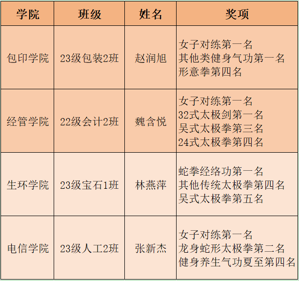 此次比赛不仅是一场竞技较量,更是中华武术文化的传承与弘扬。天职健儿在赛场上以武会友,交流技艺,展现了我校学子积极向上、奋勇争先的精神风貌,为学校赢得了荣誉。今后体育部将以此次佳绩为新的起点,继续砥砺前行,在未来的赛事中续写辉煌,让中华武术在校园绽放更加绚烂的光彩。(来源:体育部)