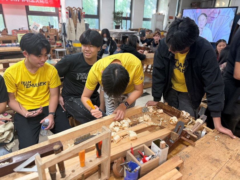研学活动以“技艺解密+沉浸体验”为主线,每个项目均由专业教师进行示范讲解,随后由学生分组实践。在中国书画研习中,许建东、高嵩两位老师以“梅花兰草”为题,向来访学生讲述梅花兰草的绘画方法及它们在中华文化中所代表的坚韧不拔的精神和高洁、清雅的品格。在杨柳青年画印制项目中,研学师生跟随任依晴老师的“勾、刻、印、绘”四道工序,亲手拓印了一张张“连年有余”的年画,研学学生捧着自己的作品感慨:“以前只在博物馆见过年画,现在知道每一道线条都是手工刻出来的,这种温度是机器无法复制的。”在体验葫芦制作技艺时,宋悦老师边示范边讲解:“葫芦谐音‘福禄’,在中国文化中象征着幸福与财富。你们看,这个镂空雕刻的‘福’字,既保留了传统纹样,又加入了新加坡的鱼尾狮元素。”学生们现场发挥创意,将心仪图案画在葫芦上,成为跨文化融合的独特纪念品。在辛全生大师工作室体验木易榫卯工艺时,辛全生大师和刘宁老师以鲁班锁为切入点,拆解了“燕尾榫”“粽角榫”等结构,当学生们尝试不用一颗钉子组装出稳固的木凳时,都惊叹于这种“以柔克刚”的连接方式。