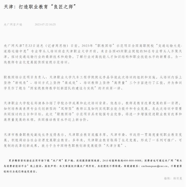 天津市教委职教处副处长李友得表示,天津职业教育底蕴丰厚,天津市委、市政府一贯高度重视职业教育发展,积极调动全社会资源发展职业教育。多年来,天津职业教育取得了长足发展,形成了一系列可推广、可复制的改革创新成果,致力于为中国特色职教创新发展提供“天津方案”。