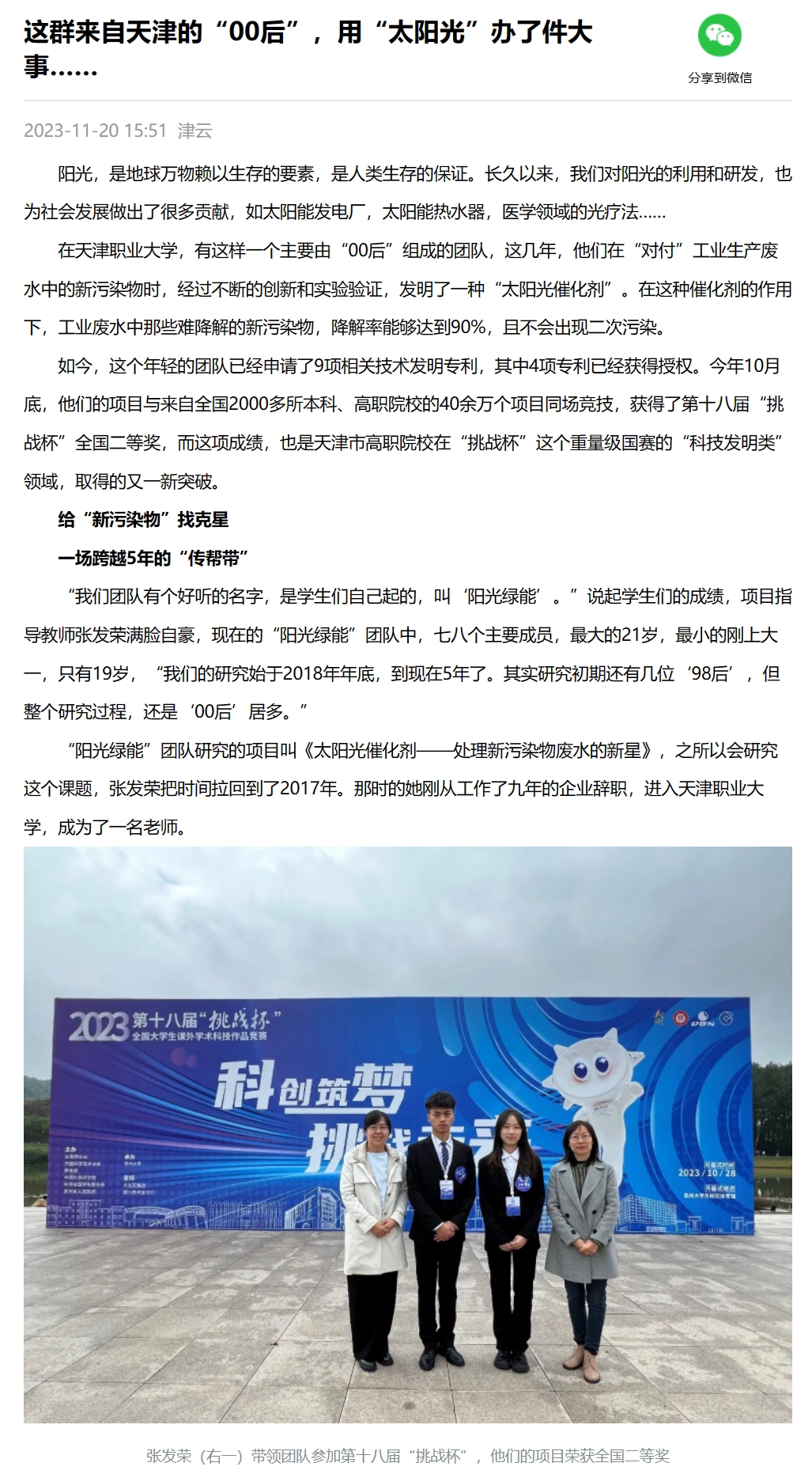“阳光绿能”团队研究的项目叫《太阳光催化剂——处理新污染物废水的新星》,之所以会研究这个课题,张发荣把时间拉回到了2017年。那时的她刚从工作了九年的企业辞职,进入成人色情,成为了一名老师。